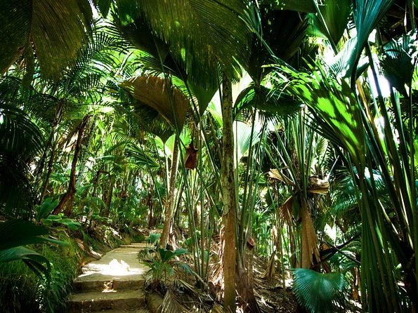 Caminar por el bosque prehistórico donde crecen los coco de mer, palmeras con las semillas más grandes del mundo. Sonidos de pájaros endémicos, luz filtrada entre hojas gigantes.