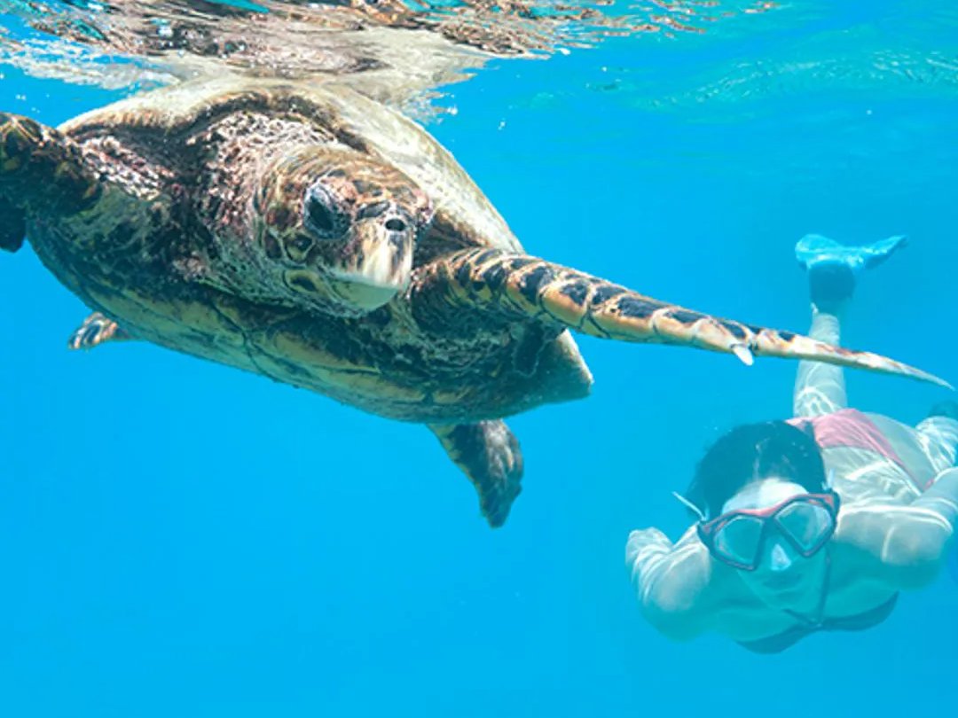 Nadar con tortugas marinas en las aguas cristalinas. En Anse Lazio, en Curieuse, en muchas playas. Un encuentro que nunca olvidas.